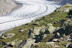 Sobota 7.7.2012 - Budíme se asi ve čtvrt na sedm a po snídani vše balíme. Za deset minut osm čekáme připraveni opustit kemp a vydat se na tůru kolem Aletschského ledovce. K němu přijíždíme zhruba v devět hodin, kupujeme lístky na lanovku a necháme se vyvézt do vesničky Bettmeralp. Tam procházíme městečkem až k další lanovce, která nás vyváží na nejvyšší místo místního lyžařského areálu, kde začíná naše tůra. Po vystoupení z lanovky a ujití pár desítek metrů nás překvapí dech beroucí výhled na nejdelší ledovec v evropě Aletschgletscher. Prodíráme se hromadou japonců, která fotí o stošest a vydáváme se na stezku. Ta obtáčí horu a jde souběžně s ledovcem - proti proudu. Zhruba po dvou hodinách se od ledovce odkláníme k jezerům a pokračujeme po červené stezce dál. Stezka nás zavede k dlouhému, spoře osvětlenému tunelu, pomocí kterého si zkracujeme cestu a dostáváme se do druhého údolí blíže k Fischeralpu. Po dalších pár kilometrech už se celkem unavení dostáváme po vrstevnici do vesničky Fischeralp. Je to malá klasická vesnička s roubenkami ale i s velkými hotely a terasami. V zimně jsou zde všude sjezdovky. Na rozcestníku se dozvídáme, že cesta do Bettmeralpu nám bude trvat ještě něco málo přes hodinu. Pokračujeme tedy směr Bettmeralp. Cesta je celkem příjemná až na závěrečné klesání do vesnice. Chůze z kopce po nezpevněném povrchu není pro unavené nohy nic příjemného. Nakonec se zdárně došouráme ke stanici lanovky, kterou míříme zpět dolů do Bettmerhornu, kde máme zaparkované auto. Zhruba v půl čtvrté vyrážíme směr Täsch (k Zermattu). Cesta je příjemná a do kempu přijíždíme asi v pět hodin. Kemp byl hezký. Ležel hned vedle horské řeky a železnice, ostatně jako zatím každý kemp. Po opravě prodlužováku, sprše a večeři uleháme.