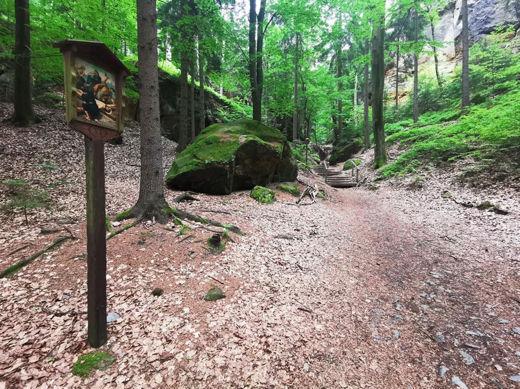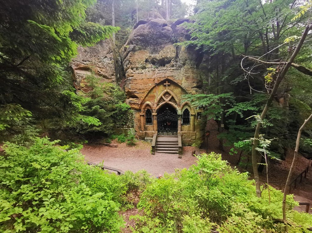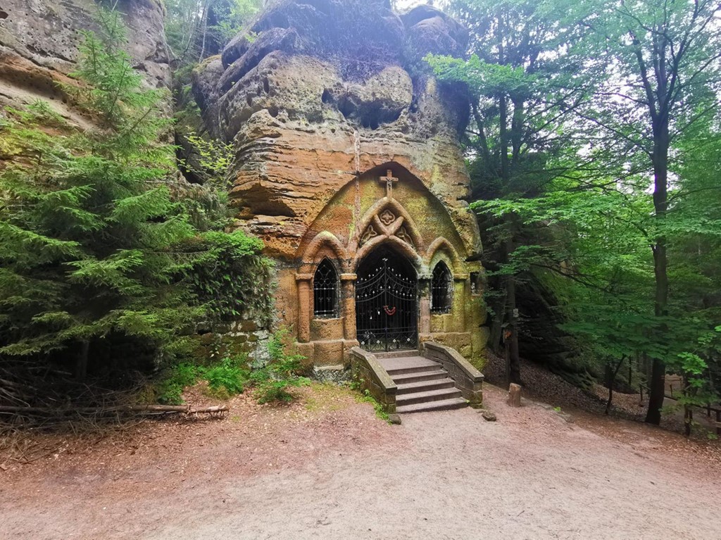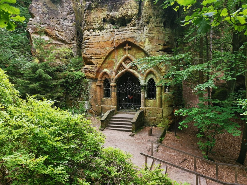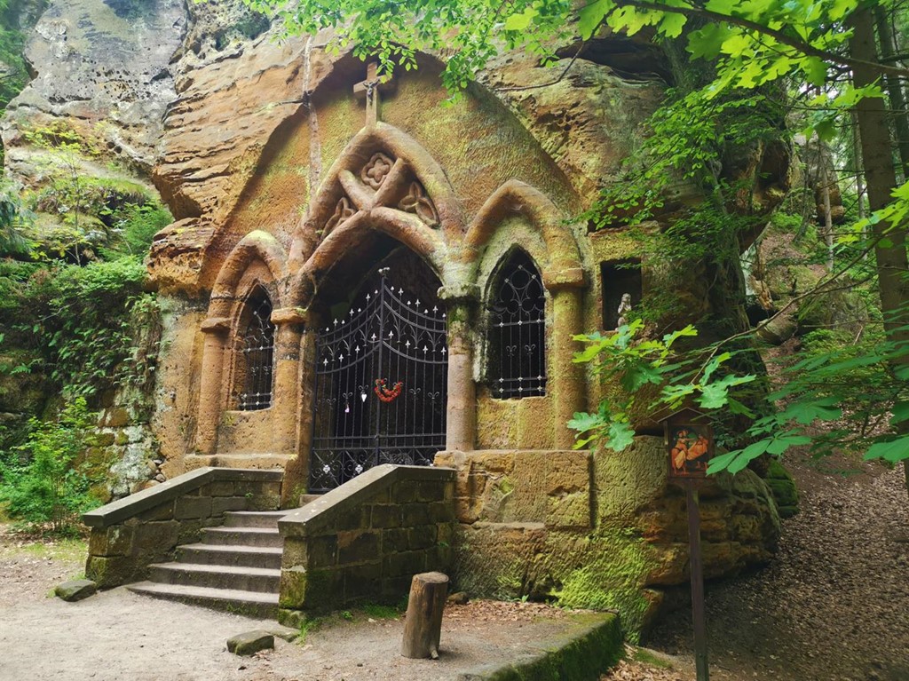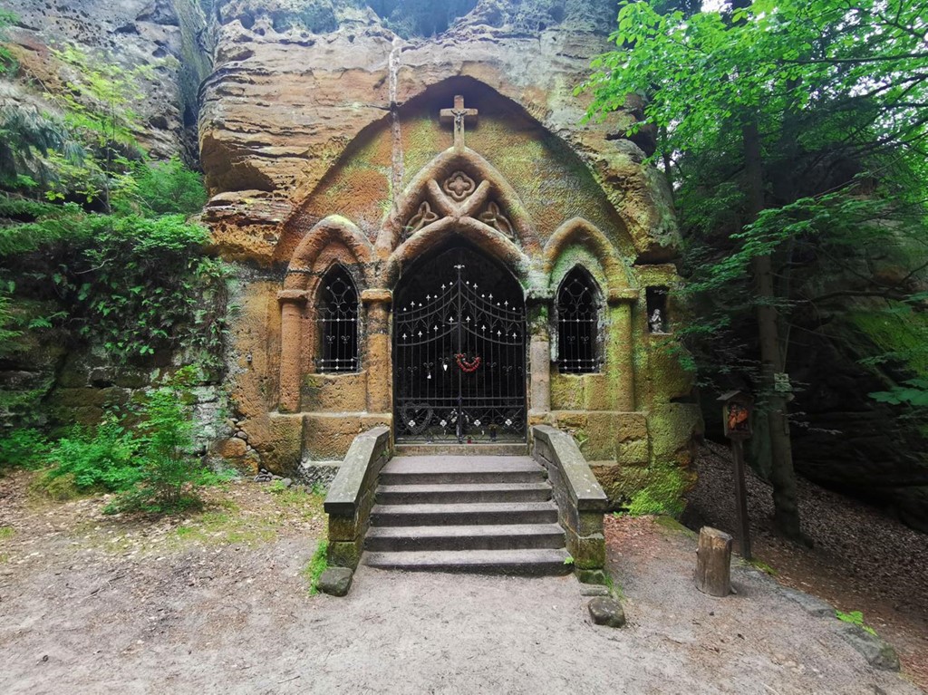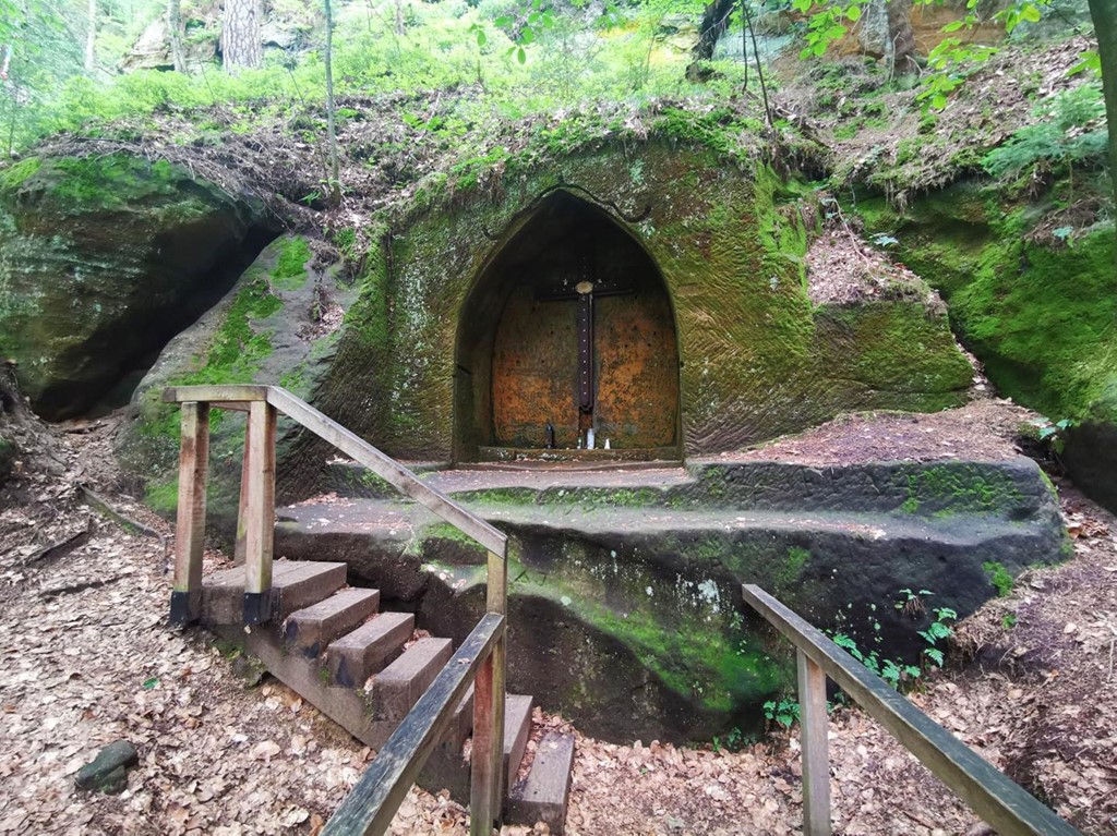 Modlivý důl je malebné poutní místo ukryté v lesích nedaleko obce Svojkov na Českolipsku. Tento romantický skalní kaňon vznikl přirozenou erozí pískovcových hornin a po staletí láká návštěvníky svou zvláštní atmosférou klidu a spirituality. První zmínky o Modlivém dole pocházejí z 18. století, kdy zde obyvatelé Svojkova nacházeli útočiště pro tajné bohoslužby v době náboženského útlaku. V té době vznikla i první modlitebna, vytesaná do skály, která dala místu jeho název. V 19. století zde byl zbudován unikátní skalní kostelík zasvěcený Panně Marii Lurdské, vytesaný přímo do pískovcové stěny. Vchod do kaple zdobí goticky laděný portál a nad ním reliéf Panny Marie s Ježíškem, který dodává místu mimořádnou atmosféru. Po druhé světové válce místo postupně chátralo, avšak díky dobrovolníkům a místním nadšencům bylo v posledních desetiletích citlivě obnoveno.