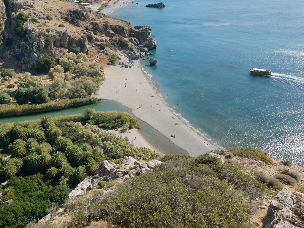 Preveli Beach se nachází 35 km jižně od Rethymna a je jednou z nejkrásnějších pláží na Krétě. Její krásu pravděpodobně ovlivňuje i to, že není jednoduše dostupná. Pokud ji chcete navštívit, musíte buď připlout lodí, nebo přijít pěšky strmým svahem (zhruba 20 minut). Preveli Beach je také známá jako Palm Beach a to díky přirozenému výskytu datlových palem (společně s pláží Vai jsou tímto na Krétě unikátní). Palmové háje podél řeky Kourtaliotis vás zavedou do tak trochu jiného světa. Palmy druhu Theophrastus zde pokrývají téměř 4 hektary půdy. Pláž Preveli pokrývá jemný písek smísený s oblázky a vstup do moře je poměrně příkrý. Díky ustí řeky se vám zde naskytne unikátní příležitost koupat se zároveň ve vodě slané mořské, i sladké říční. Na pláži nenajdete půjčovny lehátek ani slunečníků. Zázemí tvoří kiosek s občerstvením, WC (nic moc) a sprchou. Nachází se zde také skála ve tvaru srdce - "kámen zamilovaných".