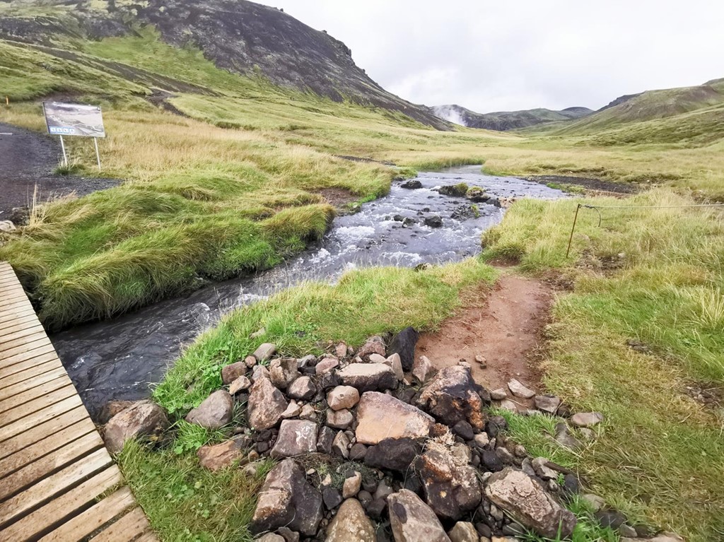 Stezka začíná na parkovišti, kde nejprve překročíte most přes řeku a pokračujete po štěrkové stezce kolem bublajících potůčků a bahenních jezírek. Postupně pak stoupáte kolem krásného vodopádu dále do údolí Reykjadalur. Cesta k termální řece měří 4 km a zvládnete ji asi za hodinku a půl. Stejný čas si pak vyhraďte a cestu zpět.